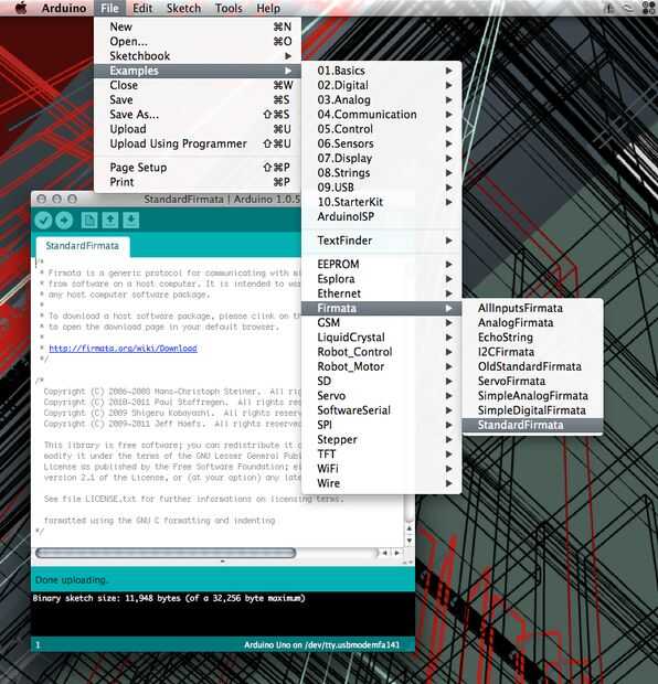 7: con el Arduino conectado abrir el IDE de Arduino y cargar la secuencia de comandos de ejemplos / una firmado / StandardFirmata