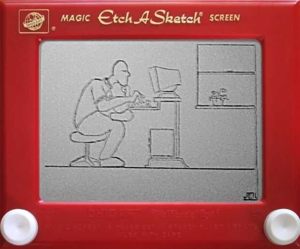 El Etch-a-Sketch es un juguete que fue inventado en 1955 por un electricista francés, André Cassagnes. Utiliza dos perillas para mover una aguja interna a través de una pantalla al polvo cero gris de superficie debajo de la pantalla. Es enteramente mecánica tecnología - no electrónica en todos. Líneas horizontales y verticales se pueden establecer fácilmente pero las diagonales y curvas toman mucha práctica.