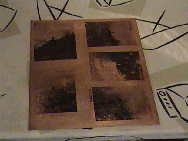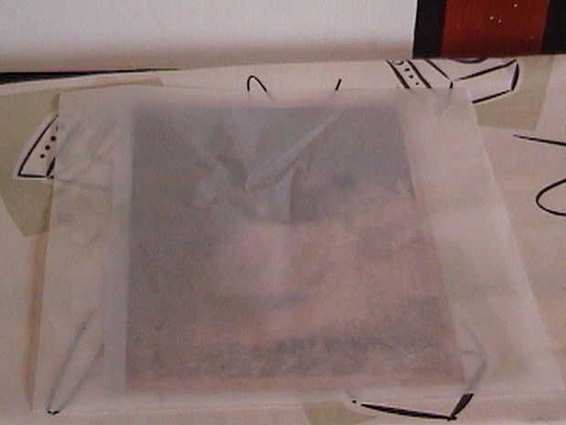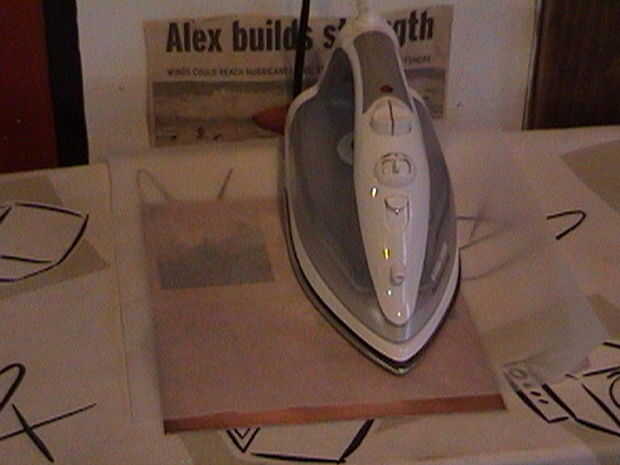 Coloque la placa de cobre sobre la tabla de planchar. Coloque la transparencia sobre él (la tinta hacia la placa!). Ponga un trozo de papel encerado sobre la transparencia.