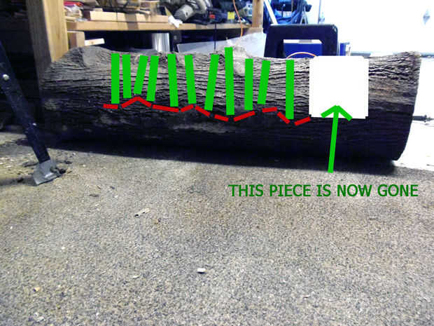 Por tu bien, voy a publicar lo que debe hacer. Será doloroso, pero es posible salvar ese pedazo de basura que acaba de hacer. Aquí es qué hacer: la imagen muestra un montón de cortes que no están a la misma profundidad. Cada línea verde es un corte con motosierra te. No son rectos ni son con la misma profundidad. La línea roja muestra el desnivel de la superficie de escritura. Ignorar la etiqueta de 'Este pedazo es pasado' como se saltan esa parte. Se necesita un cincel para suavizar las asperezas realmente. La mayoría de los bordes serán realmente áspera. Esto tomará mucho trabajo y sudor, pero usted puede mejorar dramáticamente la apariencia de la superficie de escritura.