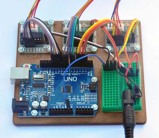 Ahora conecte las conexiones en la breadboard 170 de punto del lazo. Utilice el diagrama de cableado en el paso 11 para la dirección. La energía del adaptador de corriente 6V 1A funciona en el conector de barril en el protoboard mini y proporciona la energía para los tres motores paso a paso. NO haga funcionar la potencia a la toma de alimentación de Arduino, los motores requieren más corriente que se debe ejecutar a través de Arduino. Cuando programar el Arduino, recibirá alimentación a través del puerto USB. Arduino tierra deben estar amarrados a tierra de energía como en el diagrama. Arriba es una foto de los cables en una EtchABot real.