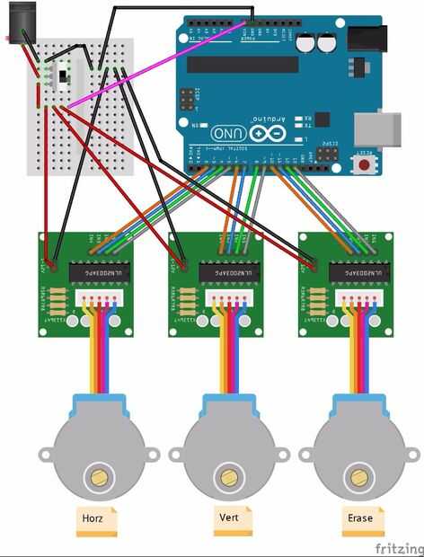 Cuando se ejecuta un boceto que no requiere un ordenador, puede alimentar el Arduino desde el enchufe. Esto requiere una conexión adicional de la energía positiva a los pines de Arduino Vin. (véase el diagrama arriba – la conexión adicional es en rosa). Asegúrese de no conectar el equipo al Arduino con el cable USB mientras la conexión de alimentación adicional. Si haces el EtchABot puede intentar alimentar los motores con potencia desde la USB, que tira demasiado actual a través de Arduino.