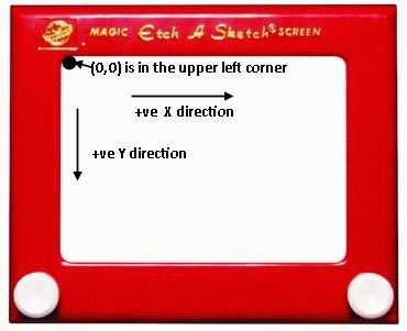 Para referencia, la esquina superior izquierda de la Etch A Sketch se define como (0,0) y las direcciones positivas están abajo y a la derecha (ver imagen). Las dimensiones de pantalla Etch A Sketch total en unidades de pasos de motor paso a paso son: [6000, 4000] (tamaño de bolsillo) y [6500, 4600] (tamaño viaje).