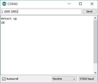 Una vez que la aguja está cerca de la mitad de la pantalla Etch A Sketch, conectar tu Arduino a tu ordenador, abrir el IDE de Arduino y descargar el bosquejo EtchABotDriver. Después de ha descargado, abrir la ventana de Serial y establecer la velocidad en baudios a 57600. Debería ver un mensaje que dice "#start up/OK". Asegúrese de que el EtchABot se enciende (los motores tienen potencia) y escriba la frase "L 1000 1000;" en la serie de ventana (tal como se muestra sin las comillas, el punto y coma y espacio es importante) y escriba un retorno de carro. Este comando le dice a la EtchABot para dibujar una línea en coordenadas absolutas de la posición actual, que se supone que es (0,0) a (1000, 1000). Si todo está funcionando correctamente, debería ver una línea que corta, diagonal a la derecha y hacia abajo. Si la línea apunta en otras direcciones, uno o ambos de su horizontal/vertical paso a paso motores están conectados incorrectamente para la biblioteca de EtchABot.