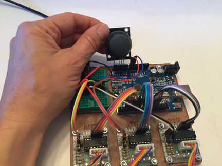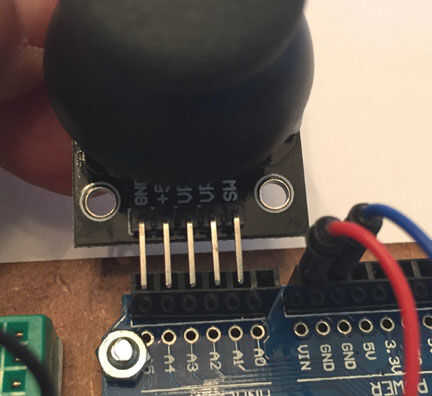 Puede usar un joystick de pulgar para controlar el dibujo y borrado de las funciones de la EtchABot. El kit EtchABot viene con uno, o usted puede proporcionar su propio. Cableado para arriba es fácil. El joystick tiene generalmente 5 pernos: GND, VCC, Vx, Vy, SW (SW = interruptor). Usted puede conectar ésos directamente en la fila de pines analógicos como se muestra, para que el cableado es: → GND A5, Vcc → A4, Vx → A3, Vy → A2, →A1 SW