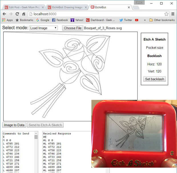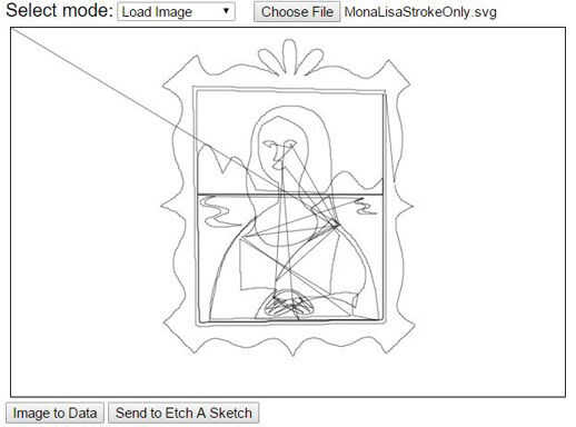 Cuando se hace conversión de los SVG a coordenadas, la EtchABot software extraerá el SVG como parece, pero con líneas adicionales conectando los caminos diferentes - tal como aparecerá en el Etch A Sketch. Asegúrese de que los motores de EtchABot poder (el interruptor está encendido) y seleccione "Enviar a Etch A Sketch" cuando estés listo para empezar a dibujar. El EtchABot primero borrar y luego empezar a dibujar el archivo SVG. La aguja volverá al origen cuando el dibujo está terminado.