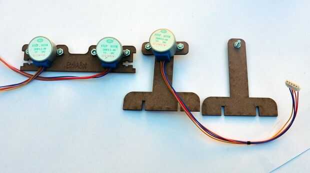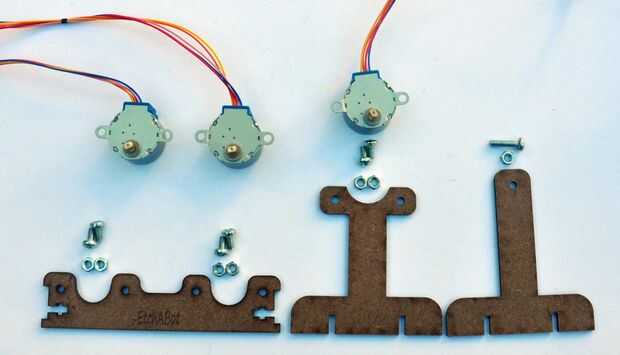 Atornille los motores en el panel frontal de madera y el soporte del lado derecho como se muestra en los cuadros utilizando los 6 de los 8 mm tornillos de M4. Cuando enrosque los motores, las tuercas van en el mismo lado que el cuerpo del motor y los tornillos van en el mismo lado como el eje del motor. Atornille el tornillo de M4 de 16 mm en el soporte del lado izquierdo como se muestra.