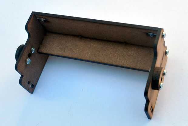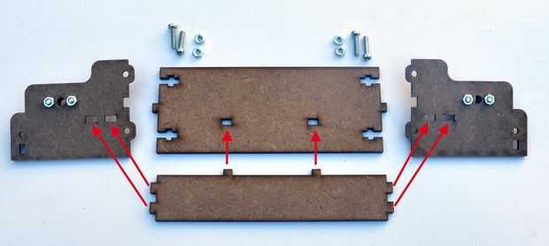 A continuación conecte los lados, hacia atrás y abajo de la EtchABot cuerpo incopora. Deslice las lengüetas en la parte posterior e inferior en las ranuras de los paneles laterales. Unir suavemente mientras está usando 4 de los M3 12mm tornillos para asegurar los paneles traseros y laterales para el cuerpo como se muestra arriba.