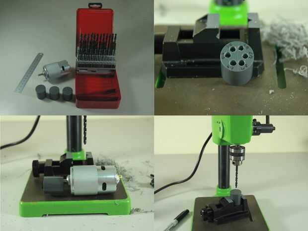 Marque el centro de las dos rondas PCV y Monte en tu pequeño vicio. Taladre el agujero para el eje del motor.