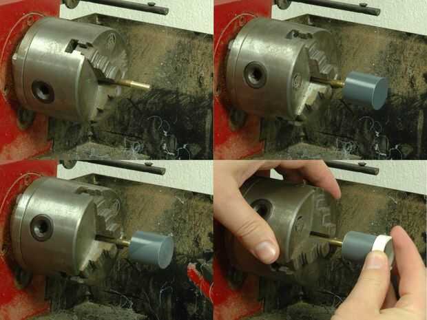 Conseguir su trozo de latón y montaje en el mandril en el torno. Gírelo hasta el mismo tamaño que el eje del motor (posiblemente de 0.05 milímetros más pequeño). Ahora esto va a ser su mandril para el acoplador de motor a su tamaño final de la máquina en.