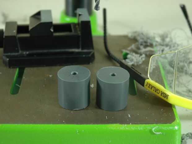Cortar tres tramos de PVC redonda. Tamaño no es demasiado crítico. Mina corté alrededor de 25mm (1"). Lo único importante es que es más largo que el agujero que va a perforar para el eje del motor. El tercer largo no va a ser utilizado en los tubos de finales. Es sólo para prueba de perforación y por lo tanto tamaño no importa en absoluto.