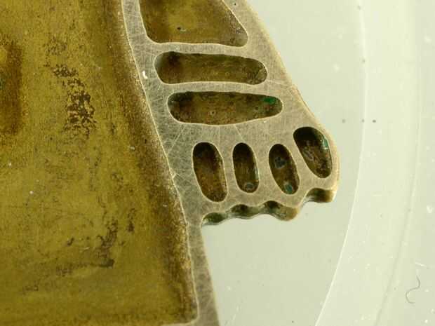 Aquí el robot de Instructables muestra gran homogeneidad en las zonas de relieve grabado al agua fuerte, que es excelente la relación profundidad/ancho de etch en esferas como las ruedas y los dedos. El robot está hecho de latón es 0,7 mm de espesor. La profundidad del grabado de pistas es de 0,35 mm y el corte es solamente alrededor 0,05 mm.