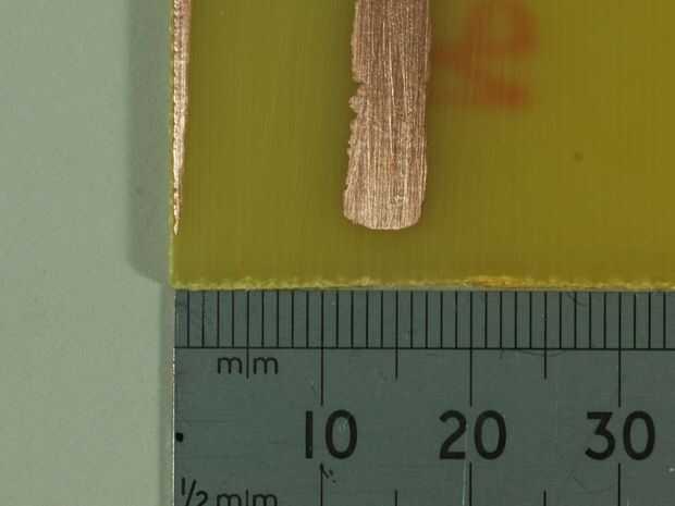 Después de 90 segundos de grabado fue quitado el cobre el resto entero de la PCB. Sólo esta gran banda y otro justo encima de él no fueron completamente grabados. La máquina se ejecute durante otros 30 segundos antes de ser detenido. El > franja de 5mm de ancho aún no mostraba signos de romper con un 33% más de largo en la máquina.