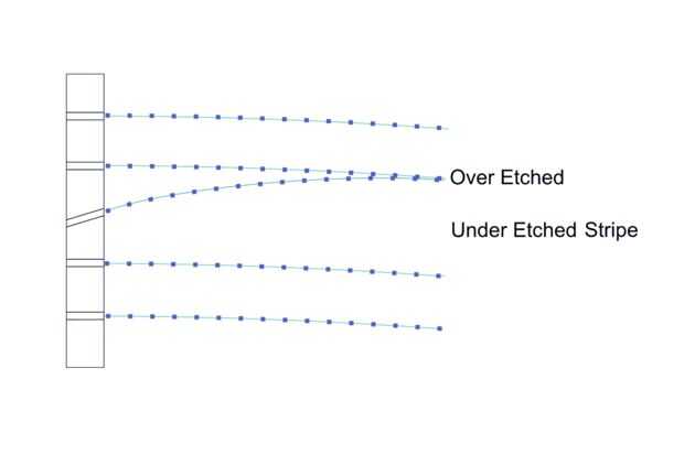 Este error tiene que ser mucho peor antes de que resulta desigual grabado. La segunda foto muestra el patrón de un tubo de spray mirando hacia abajo desde la parte superior. Este chorro tiene una variación bastante grande y no se pudo detectar ninguna desigualdad en grabado de este tubo. Casi tienes que probar y hacer un mal trabajo de alineación radial antes de que sea un problema.
