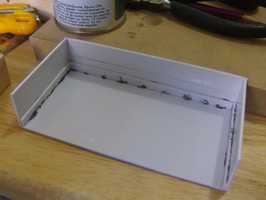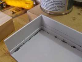 Montar los dos lateral, inferior y paneles de cemento y dejaron secar. Asegúrese de que los paneles estén cuadrados entre sí mediante un bloque cuadrado de madera y una superficie plana. Coloque el panel más grande sobre la superficie plana, Aplique cemento al panel más pequeño y lugar en posición de fijar el panel más pequeño cuadrado contra el bloque de madera. Cemento de PVC se seca bastante rápidamente y llevará a cabo después de aproximadamente 60 segundos. Pequeños espaciadores de cemento en cada esquina.