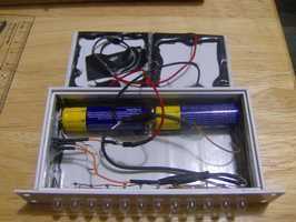 Las dos células solares en serie para conectar el cable negativo de una célula al cable positivo de la otra célula de soldadura y protección con tubo retráctil. Cinta los cables en la parte posterior de las células o virar con silicona. Conecte el conductor positivo de las dos células con el cable del diodo y proteger con tubo retráctil. Conecte el conductor negativo de las dos células solares con el conductor negativo de las baterías y los LEDs y proteger con tubo retráctil.