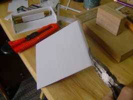 Referirse a las dimensiones en el diseño de planes (goto http://ledlights.greenwatts.info/led_light_lamp_plans.htm para los planes Lite de campamento) y cortar todas las piezas de plástico requiere. El plástico es muy fácil y descanso para producir bordes muy precisos y estrecho. Utilice alicates para romper en pedazos más pequeños.