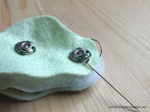 Luego, coser unas puntadas en el botón inferior con hilo conductor pasando a través de la guata (borne negativo).