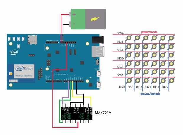 Suelde el poder, de tierra, tapas, datos, reloj y CS los pernos como se muestra en el diagrama. He utilizado el desglose de Edison Arduino, asi que soldado en cables de puente con encabezados para enchufar los encabezados en el tablero. Hacer estas conexiones desde el chip MAX7219 a la Edison: