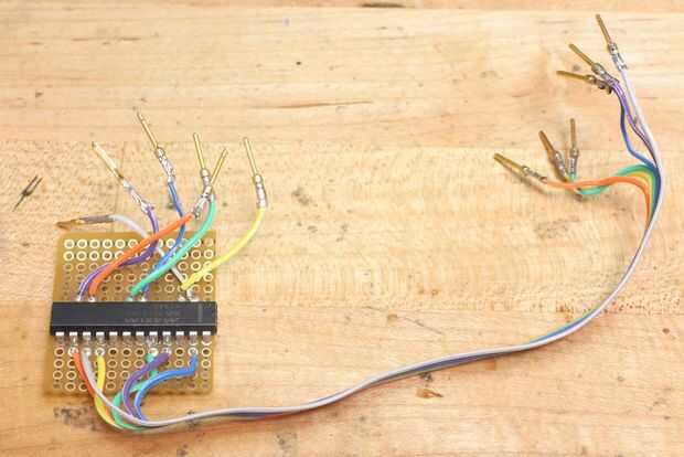 Tira hacia abajo el cable de cinta de 6 conductores y coloque 6 pines macho crimp en un extremo. Conectar ese extremo a las columnas y la longitud que usted necesita para soldar a la placa, dejar espacio para pelar para soldar la globo ocular! Corte y el alambre como se muestra en el diagrama.