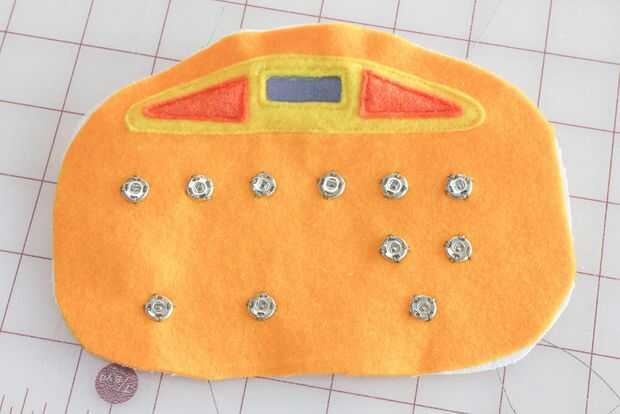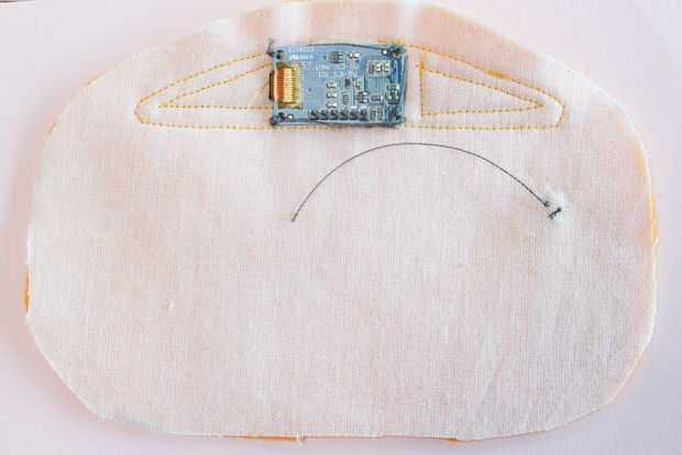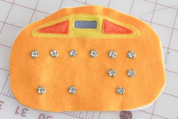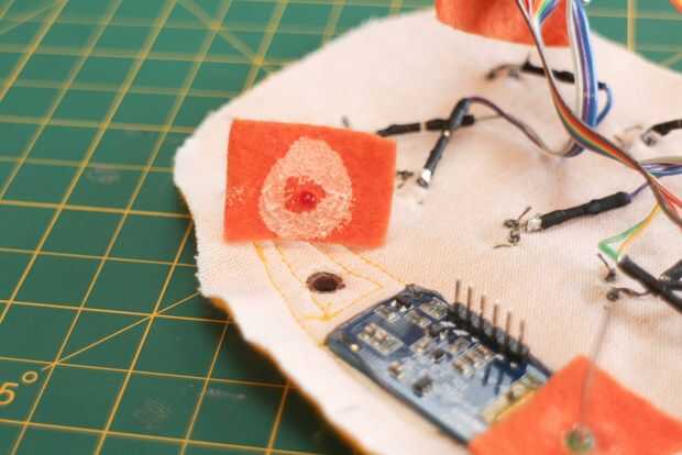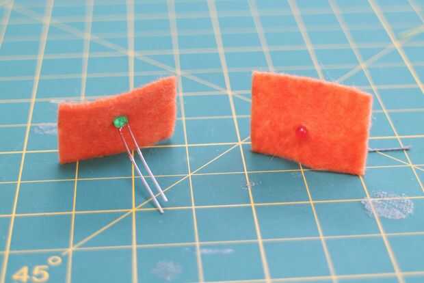 Cortadas pequeños cuadrados de algunos desechos fieltro y usan el punzón para perforar un agujero lo suficientemente grande como para la de 3mm empujar a través. Pegar la parte posterior del LED a la pieza de fieltro. Ahora puede poner pegamento en la pieza de fieltro todo el LED y utilizar para colocar el LED en la parte posterior de cada ojal.