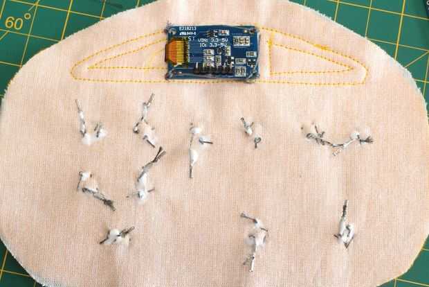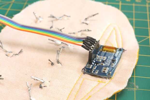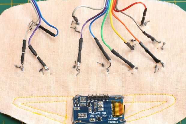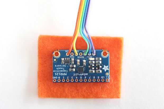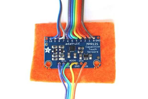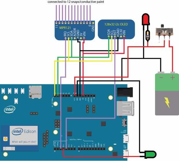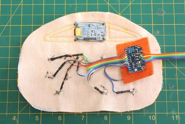 Siguiendo el diagrama, conecte el resto del hardware. Le di el MPR121 forma propia balsa fieltro, este puede ser fácilmente cosido o pegado a cualquier parte del cuerpo.