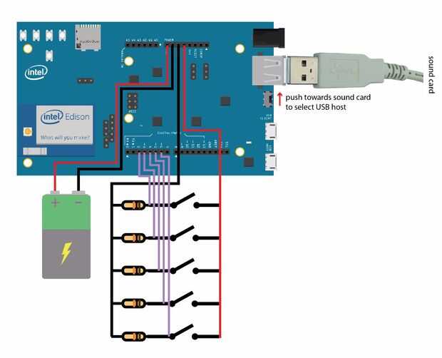 El circuito consiste simplemente en 5 interruptores (4 pliegues y 1 pompón). Obtienen resistencias de pull-down, también resistencias pull-up interna pueden activarse a través de la línea de comandos. Esas instrucciones pueden encontrarse en la Guía de hardware para el tablero de Edison.