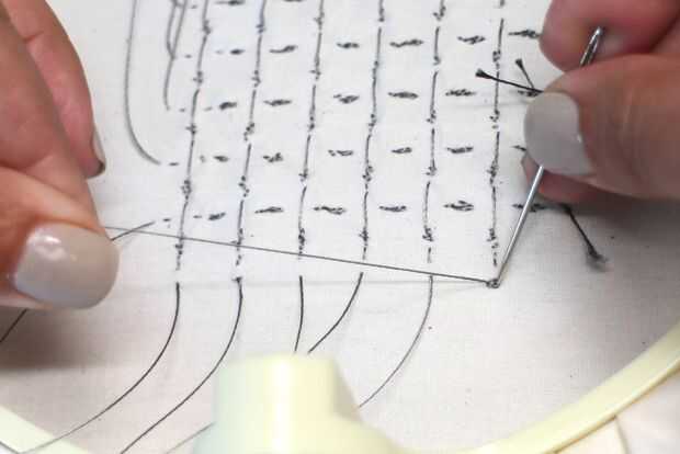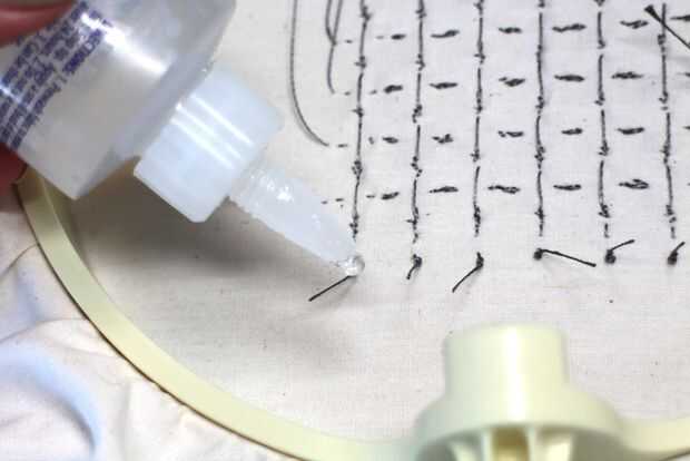 El hilo conductor de acero inoxidable es ideal porque no empañan, pero también es muy elástica y no le gusta hacer un nudo. Es donde entra pegamento. Prueba sobre la tela que está trabajando para asegurarse de que no filtre al otro lado y crear un lugar oscuro.