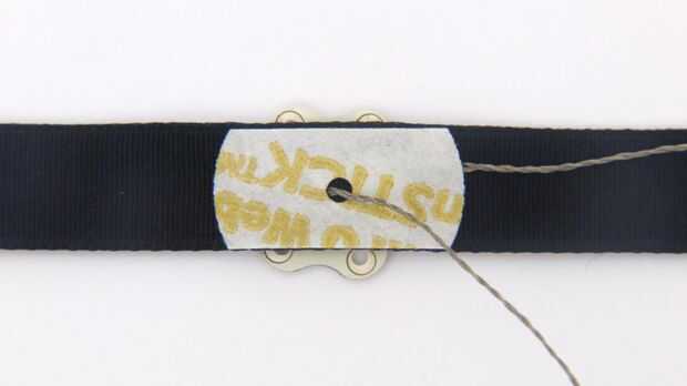Pase el hilo negativo a través del agujero en el adhesivo y luego Enrolle firmemente, por lo que es más pequeño que la batería.