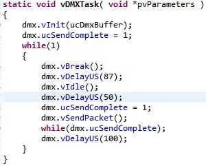 Código fuente tiene 3 tareas. Tarea de DMX512, TCP tarea y tarea de tiempo. (tareas de tiempo carece de sentido).