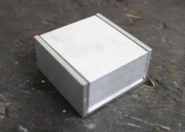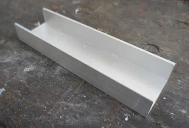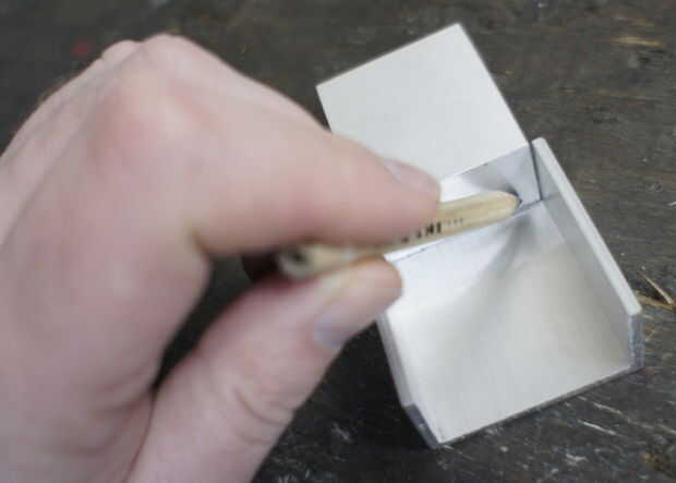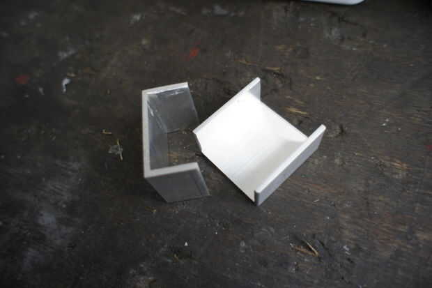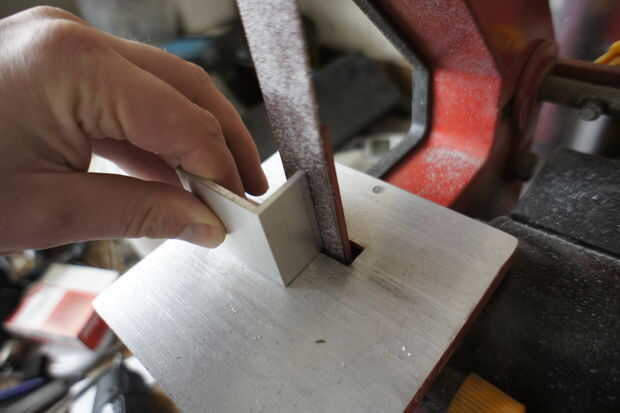 La altura de la pieza pequeña es aún una vez el grueso del material a alta. Si pones las dos piezas al lado de uno, es fácil establecer donde deben cortarlo. Empecé de lijar, pero uso de la sierra, cuando me llevó a largo. (y el aluminio en caliente para sostener)