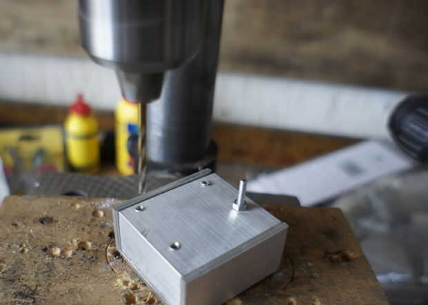 Hice este agujero 14 mm con taladro especial. Debe ser lo suficientemente grande como para poner la parte superior de una través de dedo que oprime un botón.