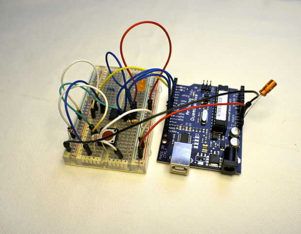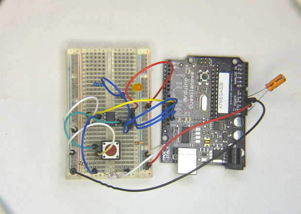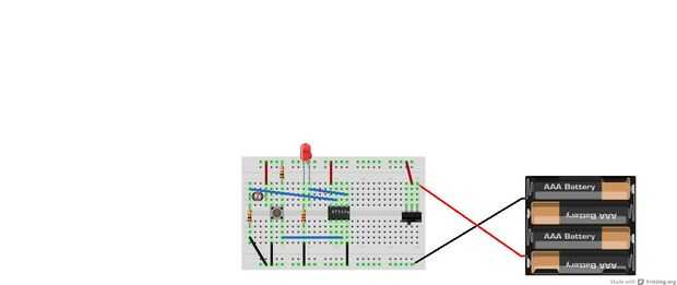 Primero ponemos el ATtiny en la protoboard. Para programar el chip, es necesario cablear hasta el Arduino. (Fijate en los dibujos para ver los números de los pines en el ATtiny)