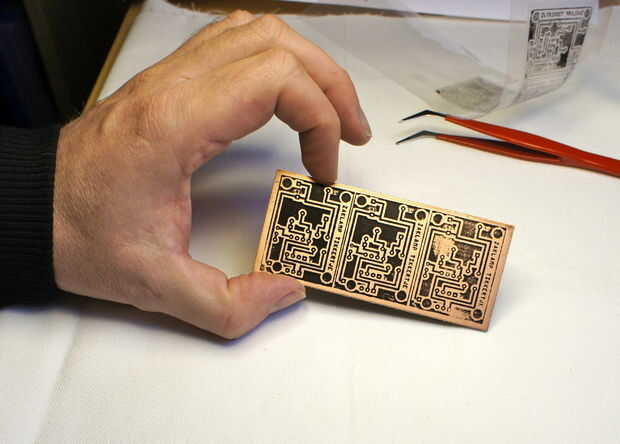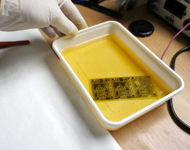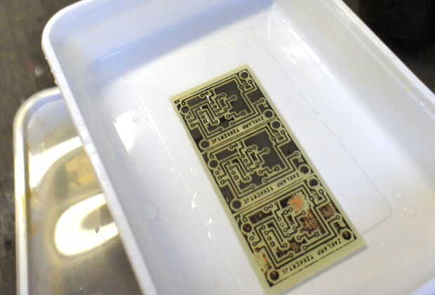Hay diferentes tipos de soluciones y diferentes métodos de grabado de la aguafuerte. Yo uso lo ferro marrón. (este material mancha algo) Me di cuenta de que el método en el hacer: video lava las sharpy-líneas, por lo que sólo permiten la solución de la aguafuerte haga su trabajo y sólo el plato un poco hasta que veo que todo el cobre que era visible es grabado al agua fuerte lejos. Ahora tome el PCB fuera de la solución y lavarla con abundante agua.