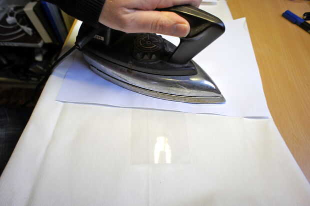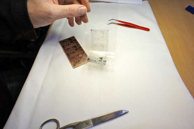 Ahora viene la parte difícil: debe colocar la hoja transparente, con la cara impresa hacia abajo en el cobre caliente. Debe ir correcto la primera vez y debe ser muy cuidado de no mover, una vez que tocó el cobre. El tóner (tinta de la impresora láser) se funde directamente sobre el cobre. Ahora sin mover la hoja de cobre, poner una hoja de papel normal, no impreso, en la parte superior y hierro otra vez.