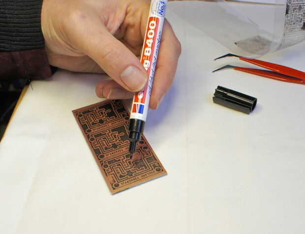 En mi caso, dos de los tres PCB que hice fueron OK, pero uno no era tan grande. Para arreglar este PCB discapacitado, tomé un sharpy y rellenar las líneas que faltan.