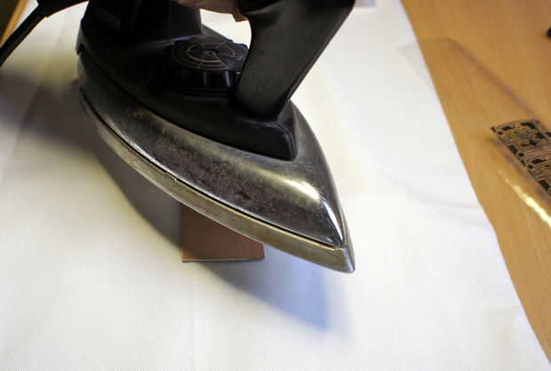 Pones la plancha lo mas caliente que lo conseguirá y calentar el cobre presionando sólo la plancha sobre él. (Asegúrese de usar una superficie que puede manejar el calor, como una tabla de planchar)