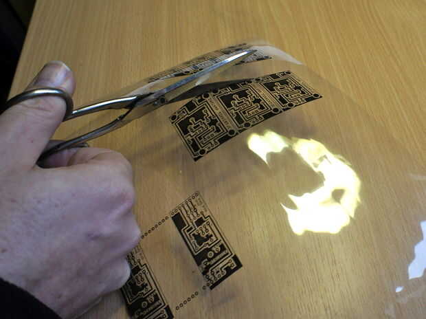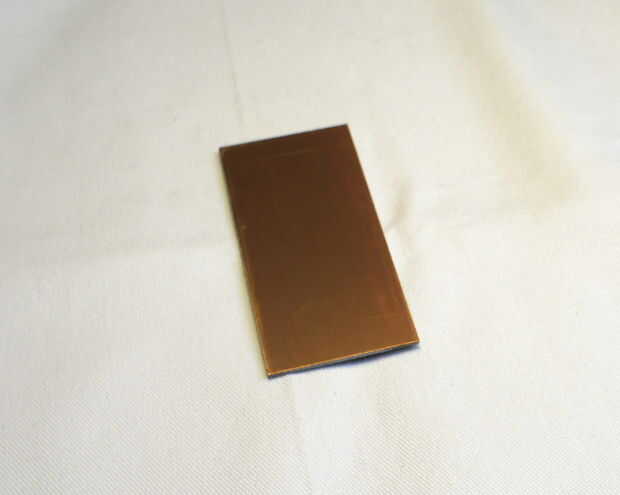 Primero recortas el PCB que desea hacer de la hoja impresa. Tan próximo que cortar algunos materiales PCB un poco más grande que su diseño. (el truco es cortarlo con un cuchillo de la manía en el cobre y que la rotura en el borde de la mesa). Antes de hacer cualquier otra cosa, es conveniente comprobar si su diseño adapta a su cobre. Ahora es una buena idea para limpiar el lado cobre del PCB material con algún tipo de solvente. (ser inteligente, usar guantes de goma)