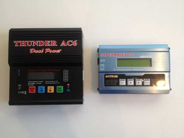 Potencia de salida- Como dije, el trueno y Supermate cuentan con salida máxima de 50W. Recordar que potencia es el producto del voltaje y actual, así que su corriente máxima que utiliza para cargar la batería depende a la tensión de la batería y viceversa. Sin embargo, cargadores también tienen un voltaje de max/min y max/min salida de corriente además de sus limitaciones de potencia. Ambos estos cargadores tienen una gama actual de salida de 0.1-5.0A y un rango de voltaje de 1-6S de LiPo (4.2-25.2V cargado). Eso significa que mientras que usted será capaz de cargar una batería de 2 a 5A (8.4V * 5A = 42W), usted no será capaz de utilizar esa misma corriente para cargar una batería 3S (12.6 * 5A =63W). Para una batería de 3S, corriente en un cargador de 50W máximo de carga será 3.9A (50W/12.6V=3.968A).