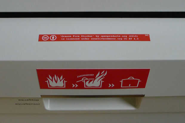 La etiqueta de incendio de grasa también está disponible para su compra a través de la tienda de Etsy de Openproducts (imprimido en polietileno repelente al agua).