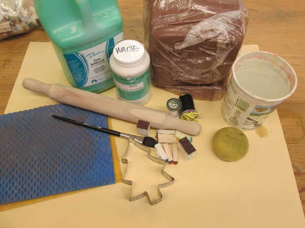 Arcilla, perno de balanceo, marcar herramientas, cepillo, esponja y pintura (en mi caso usé esmalte claro y bajo vidriado, si secado al aire arcilla es usado témpera o acrílico puede ser utilizado y entonces sugiero sellado con modge podge o poliuretano).