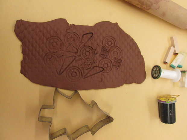 rollo de arcilla y variadas marcas de uso de la impresión a una variedad de objetos encontrados.