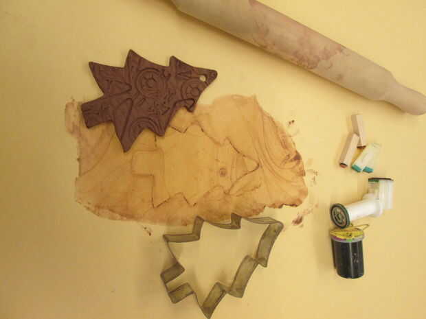 Entonces utilice el árbol con forma de cortador de la galleta para cortar ornamento. Recuerde poner un agujero en la parte superior del árbol para colgar.