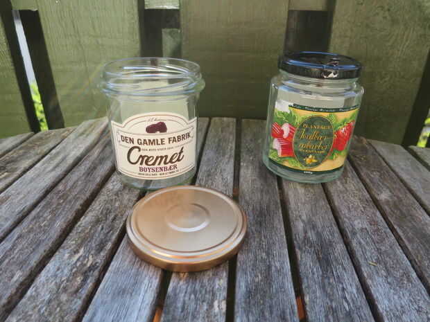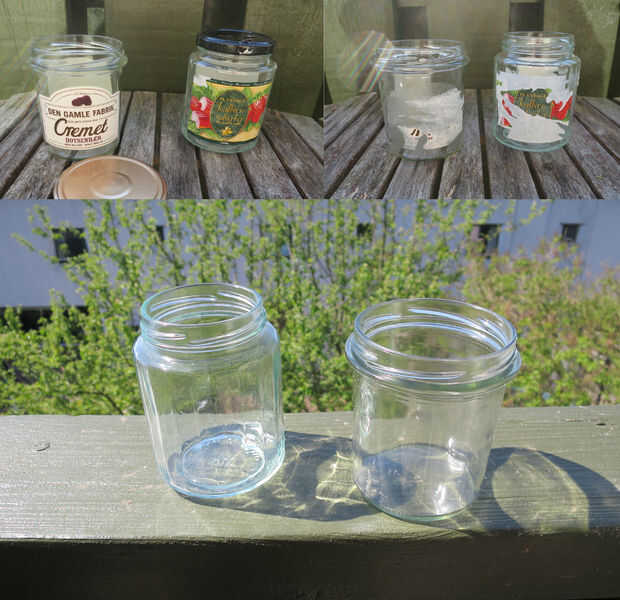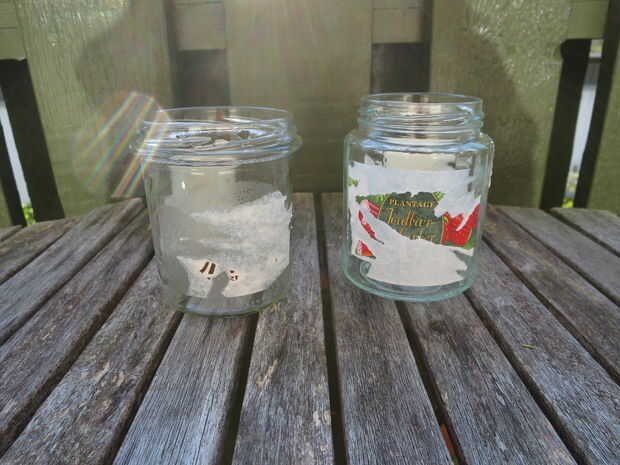 La primera foto es de dos tarros de mermelada vacía y quiso utilizar para un proyecto, y el segundo es luego que traté de Pele las etiquetas engomadas de con mis dedos - no un muy buen trabajo!