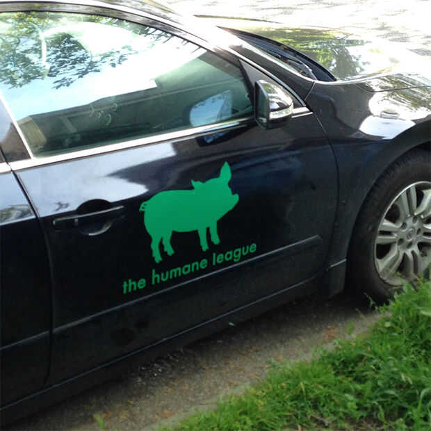 Stephanie es el director de la oficina de San Francisco de La Liga humanitaria, una organización de protección animal. Ella da presentaciones en escuelas y viaja mucho por su trabajo de divulgación. Ella vino a un Hack para la noche de animales y se nos ocurrió la idea de convertir su coche personal en algo que promueve su organización mientras viaja, por lo que ayudó a hacer esta etiqueta engomada del vinilo de corte.