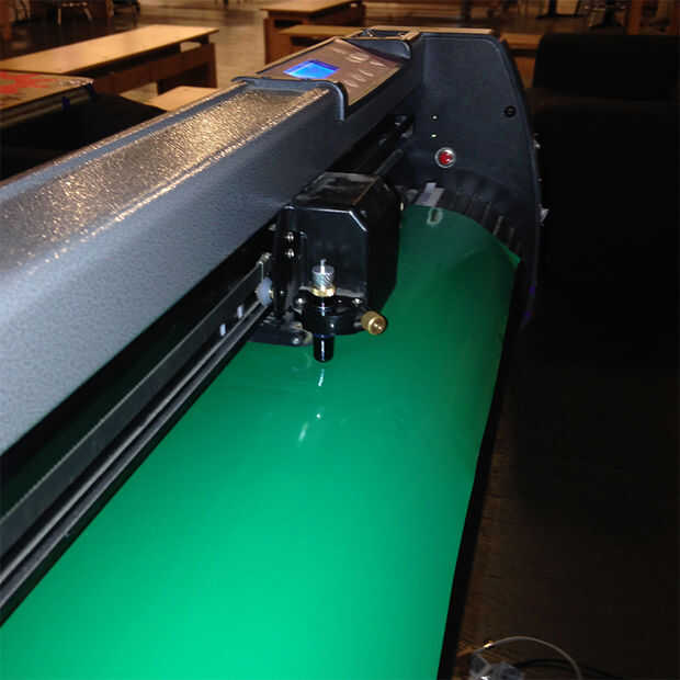 Utilizamos el cortador del vinilo en TechShop. Esta máquina lleva nuestra imagen y lo corta sobre la hoja de vinilo.