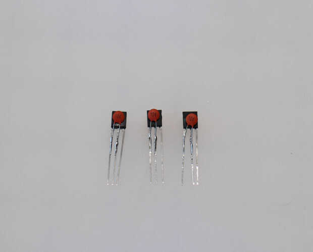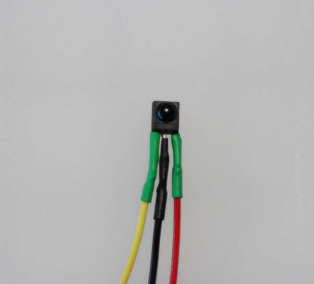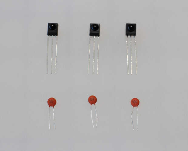 En primer lugar, la soldadura de 0,1 uF condensadores a través de los pines de alimentación del receptor IR. Mirando el piso parte (posterior) del sensor, los pines de izquierda a derecha son: energía, tierra y salida.