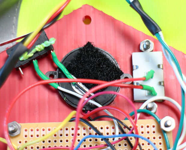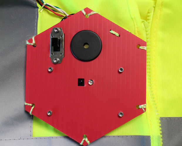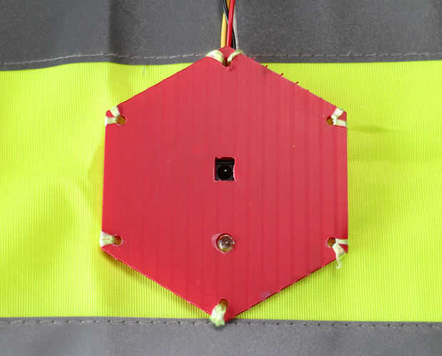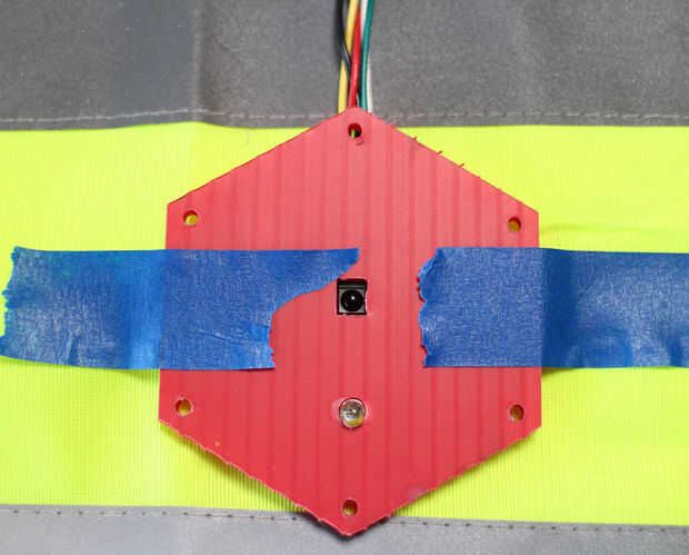 Antes de coser la almohadilla del detector principal en su lugar, poner un trozo pequeño del lazo del Velcro en la parte posterior de la piezo.