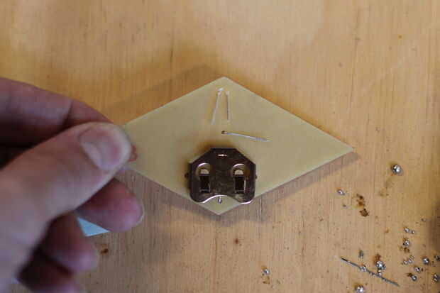 • La soldadura de los pines del clip de batería. Use suficiente soldadura para que los agujeros están completamente cubiertos con un suave redonda gota de soldadura. Usted necesitará utilizar un buen montón de soldadura. Esto asegurará que el clip se mantiene seguro al insertar la batería.