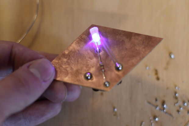 • Inserte la batería para probar el circuito. Si se enciende, continúe por. Si no es así, asegúrese de que sus pernos de LED van a través de los agujeros de la derecha y que la batería no está muerta.